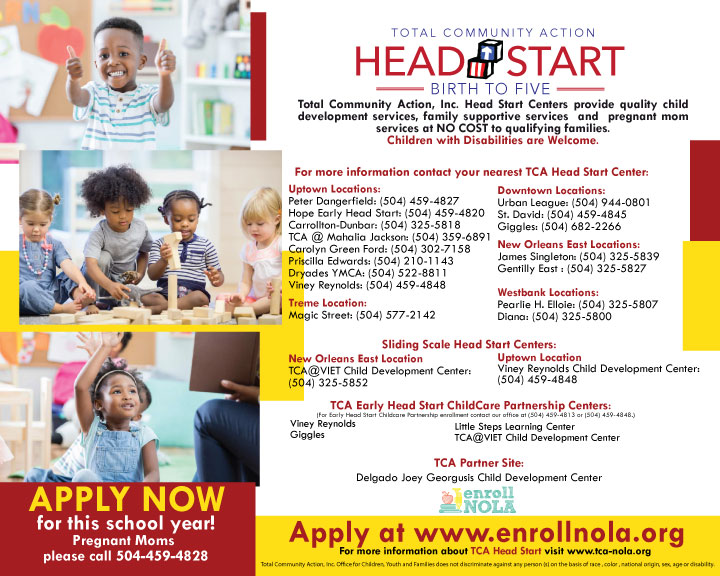 For more information, please visit your nearest Head Start Center or call the TCA Head Start main office at 504-309-3503.